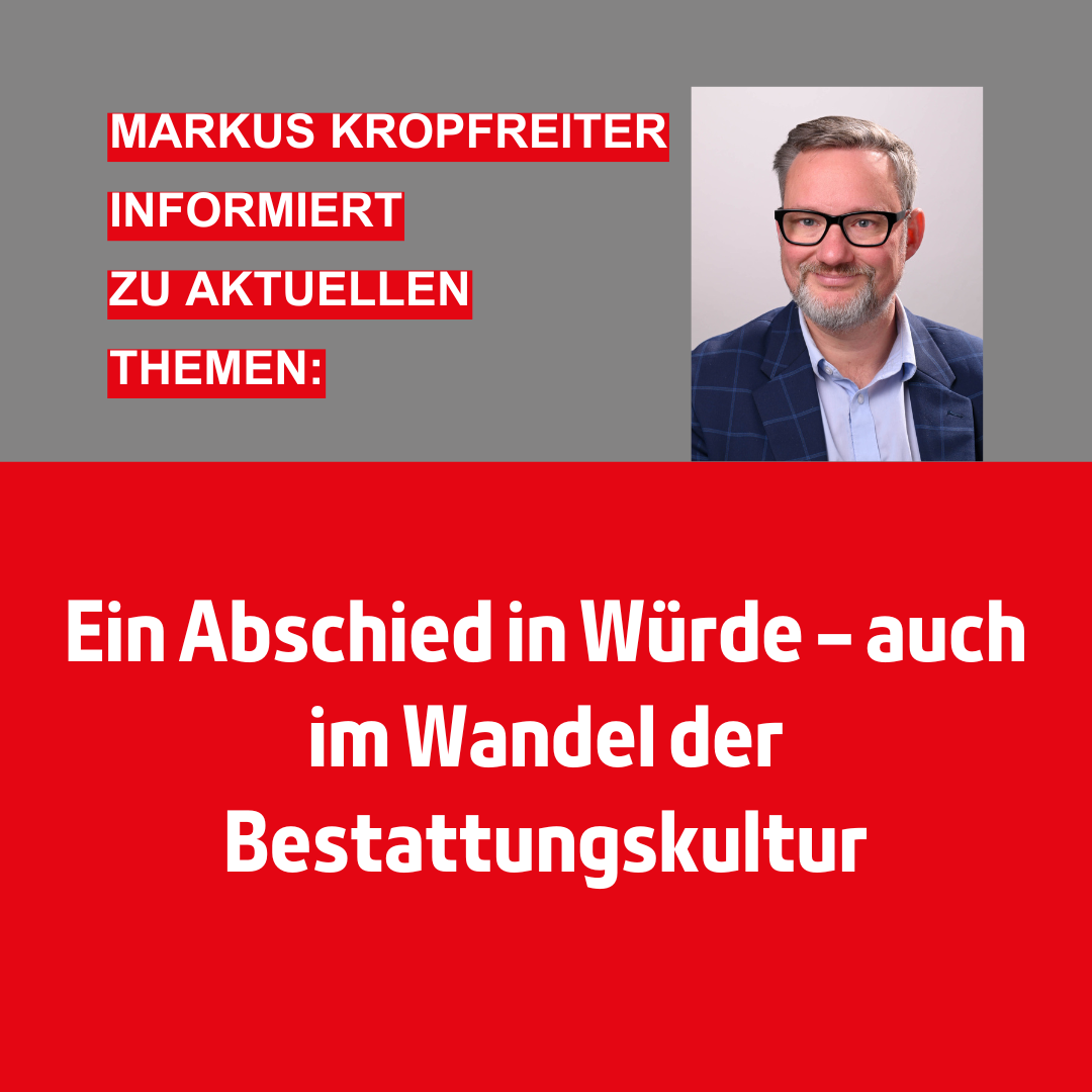„Unser Ziel ist es, auch künftig ein würdevolles Gedenken zu ermöglichen – angepasst an die Lebenswirklichkeiten der Menschen“, betont SPD- Landtagsabgeordneter Markus Kropfreiter. Als Lingenfelds Ortsbürgermeister begrüßt er die Gesetzesnovelle ausdrücklich, denn: Die gesellschaftlichen Realitäten haben sich längst verändert.